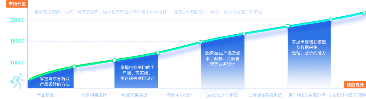 新增產(chǎn)品基礎(chǔ)、電商項(xiàng)目、移動(dòng)端項(xiàng)目實(shí)戰(zhàn)、項(xiàng)目管理、互聯(lián)網(wǎng)金融